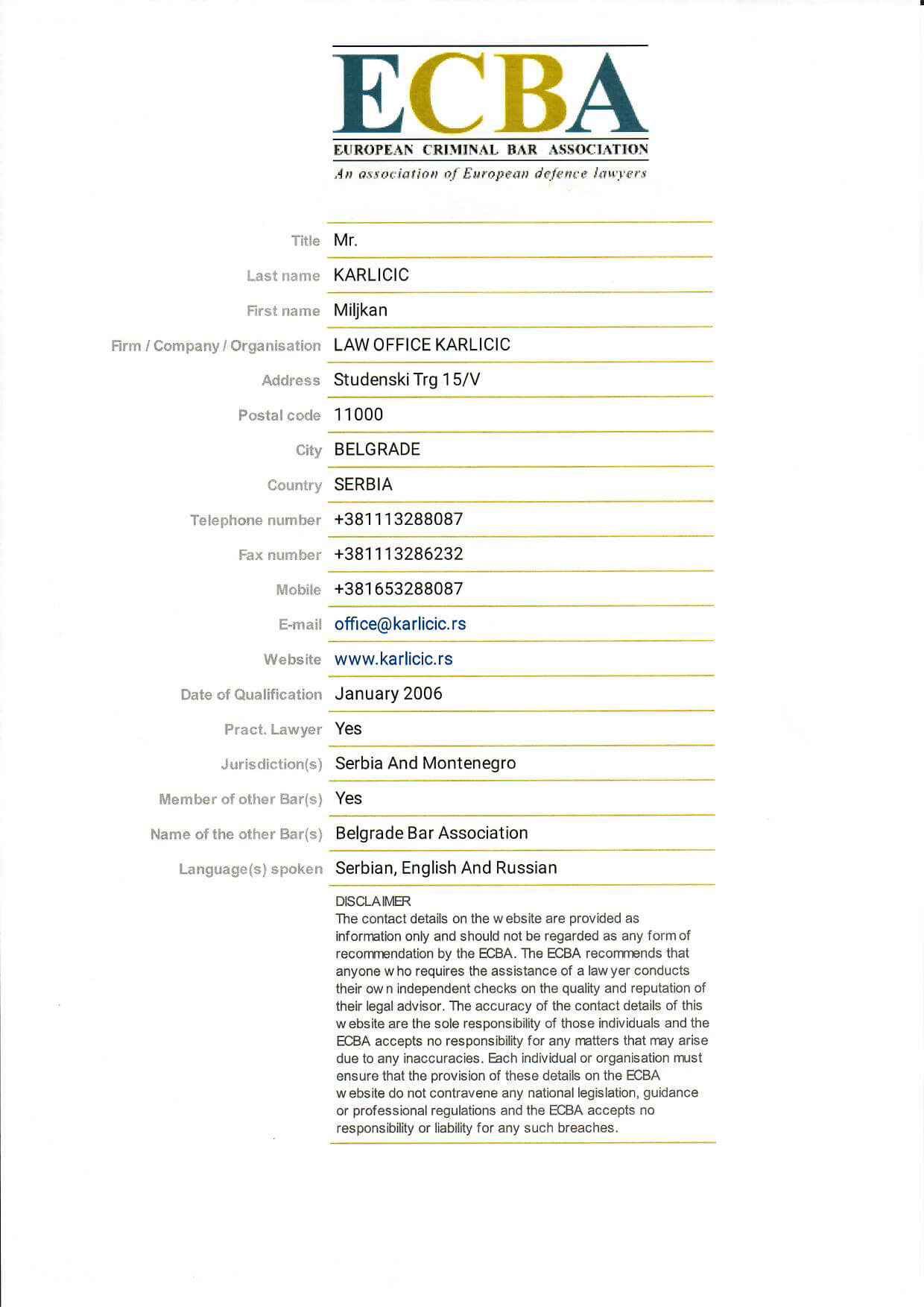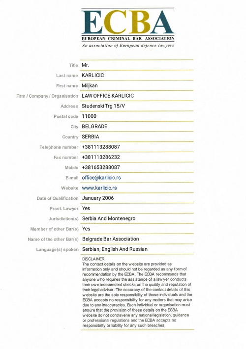 Адвокат Карличић Миљкан је субспецијалиста за пореско кривично право.